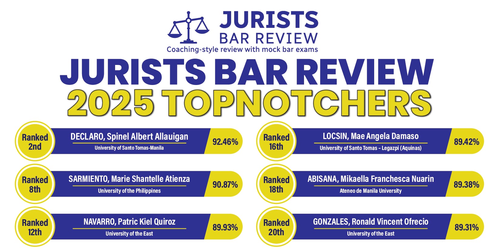 High-quality and extensive review materials, supportive Jurists Family, accommodating staff, high-caliber lecturers, well-crafted mock bar, well-trained coaches and affordable review fees. These words best describe it.